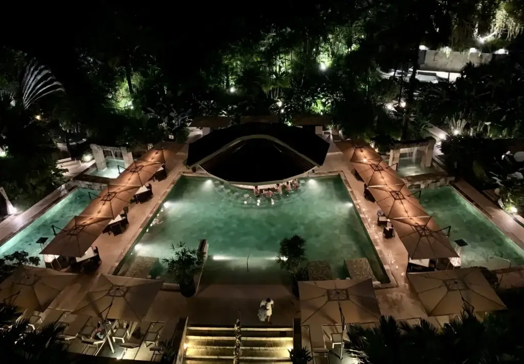Thermal pools flowed through lush gardens, their warm currents offering the most comforting alternative to winter chill. Chris and I sank into the warm volcanic waters under a sky studded with stars—no coats, no rushing, no noise. Just pure presence. We loved floating through the tiered hot springs that ranged from large pools with swim-up bars to small springs secluded by rock caverns and cascading vines.