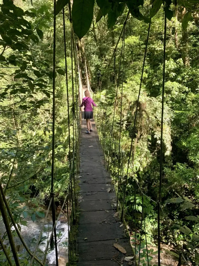 The Arenal hanging bridge experience is a walk through the rainforest canopy on a network of fixed and swaying suspension bridges. This experience offers unique perspectives of the ecosystem, wildlife, and scenic views of Arenal Volcano. The trails are well-maintained and the bridges range in height and length. If you do not enjoy heights, then maybe rethink this experience.
